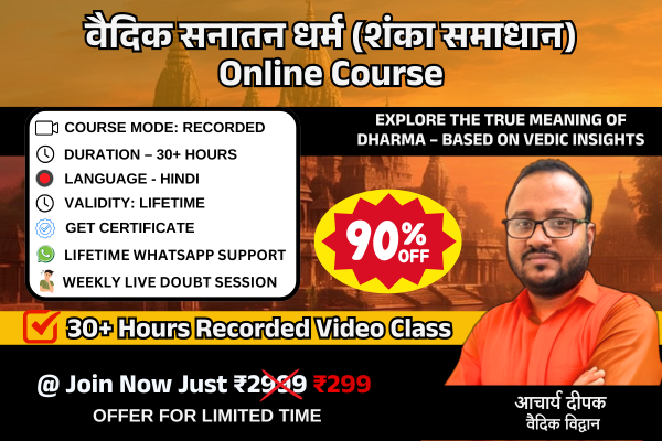 आज ही अपनी आध्यात्मिक यात्रा प्रारंभ करें! "वैदिक सनातन धर्म (शंका समाधान)" ऑनलाइन कोर्स में सम्मिलित होकर सनातन धर्म की गहरी समझ प्राप्त करें और अपनी सभी शंकाओं का समाधान पाएं। विशेष 80% छूट के साथ सीमित समय के लिए उपलब्ध – अपनी जगह आरक्षित करें और एक नई यात्रा की शुरुआत करें!